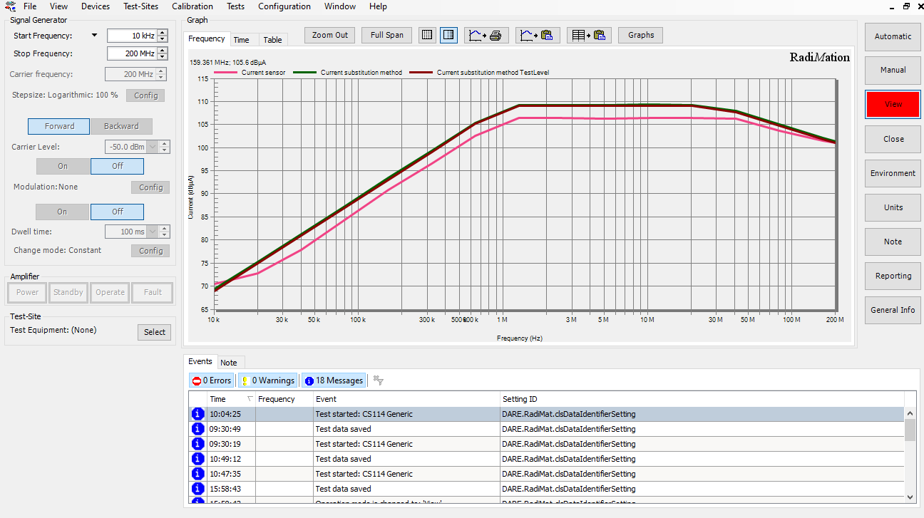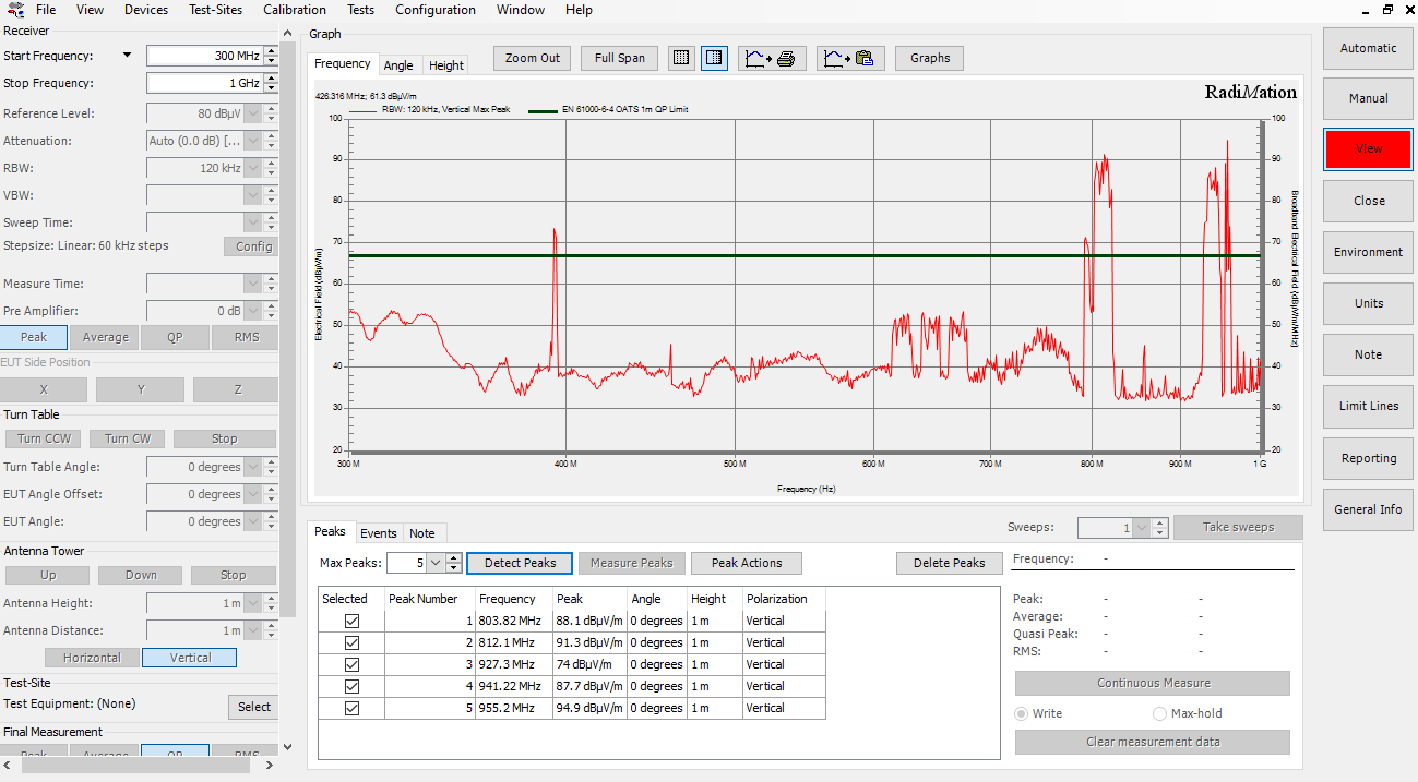 RadiMation® EMC Test software combines Immunity and Emission testing, conducted as well as radiated, plus Automated Pulsed Immunity testing and an automated test report generator in one integrated package for use throughout the test facility. Instead of automating one single EMC test, RadiMation® allows the user to perform complete EUT (Equipment Under Test) testing.